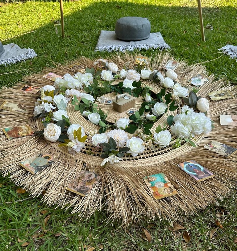 Circulo de paja con flores artificiales o naturales, sahumerio y oráculo de cartas